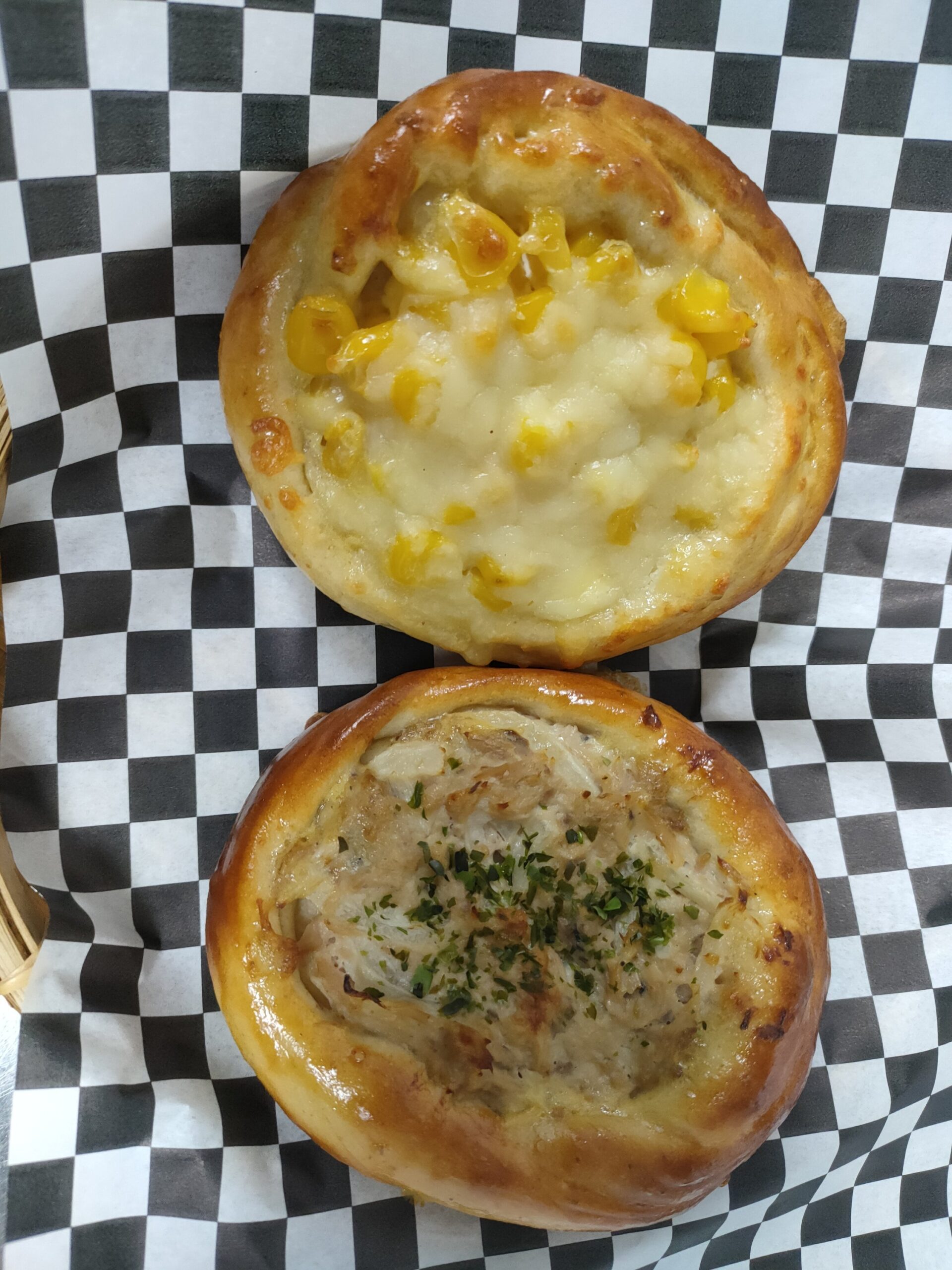 Pan casero con maíz, mayonesa japonesa y queso rallado.