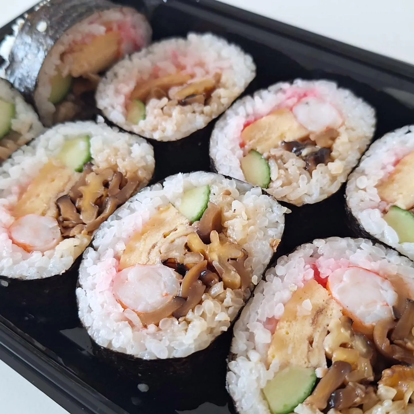 Futo significa gordo en japonés. Se trata de un rollo gordo de sushi con varios ingredientes y alga nori: tortilla japonesa, langostino cocido, pepino, denbu, nueces al teriyaki y setas shiitake.